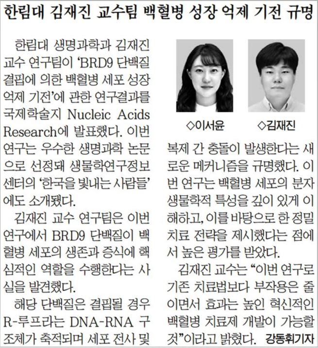 한림대 김재진 교수팀 백혈병 성장 억제 기전 규명