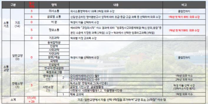“사고와표현”, “[삶의질문]삶의 큰 질문: ○○”, “프로젝트 중심 융합글쓰기”, “이공계를 위한 논리적사고와 글쓰기” 중 1과목,3학점을 필수로 이수하셔야합니다. |