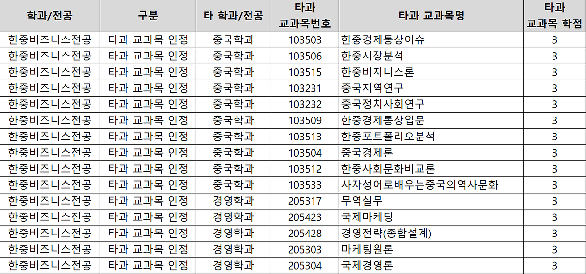 한중비즈니스:  타과 교과목 인정 15과목 (중국학과 10과목 / 경영학과 5과목)