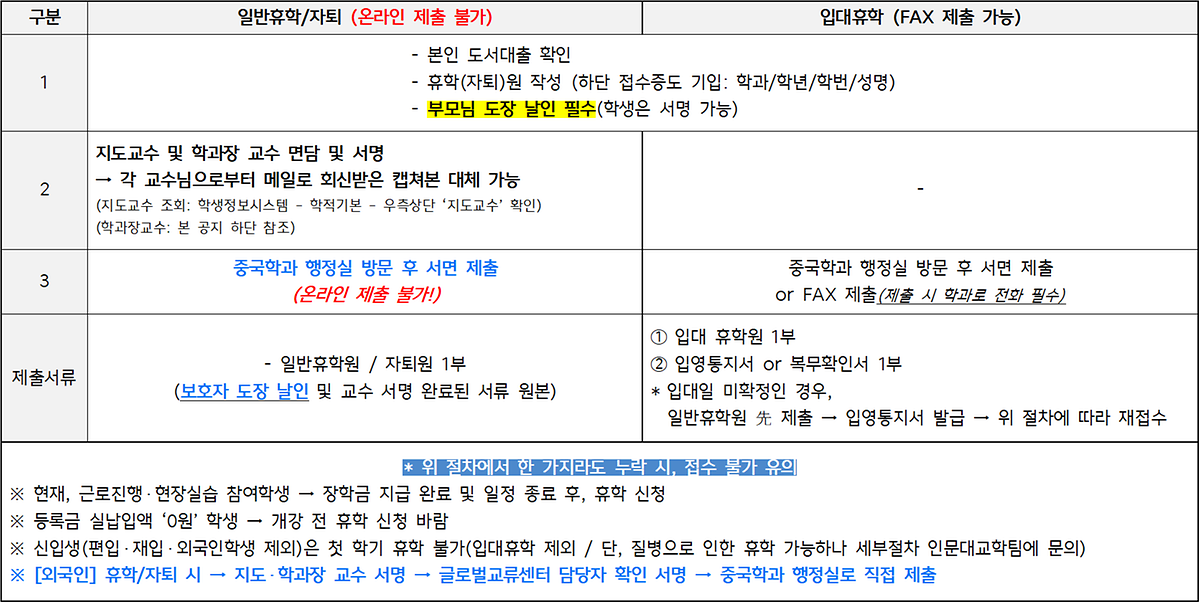 ※ 휴학원 제출방식 : 온라인 제출 불가, 반드시 행정실 방문 제출!