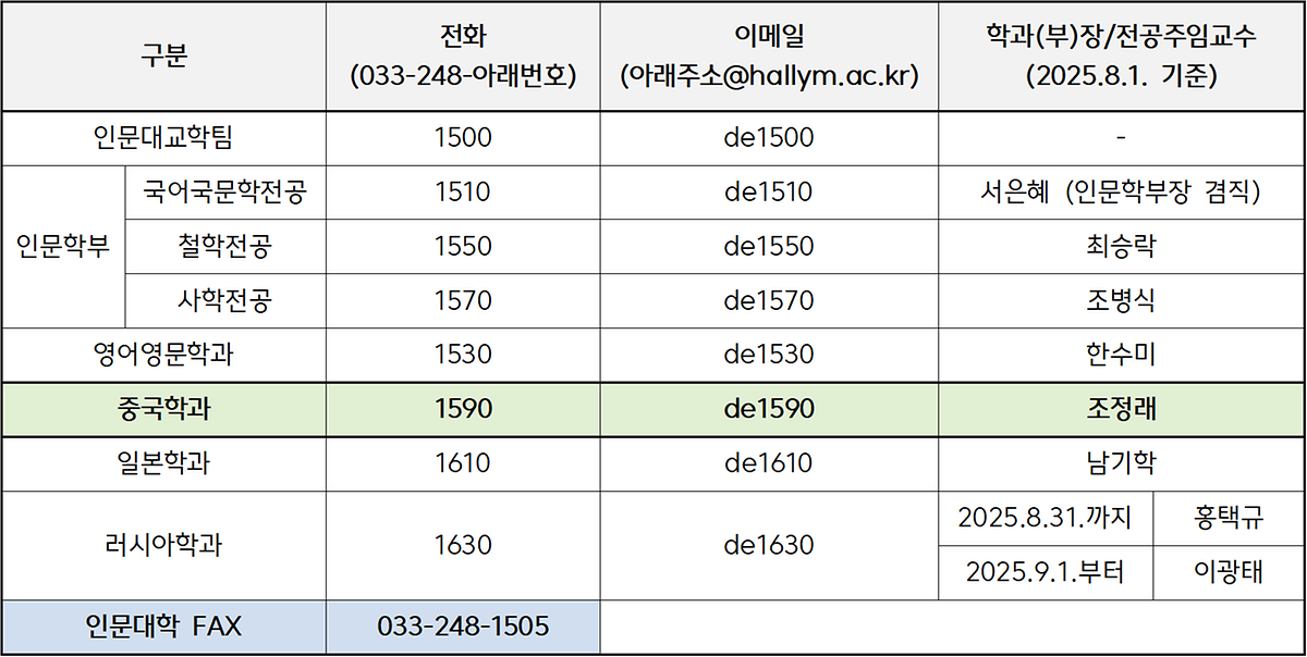 ※ 인문대학 학과/전공별 연락처·이메일주소·학부(과)장 교수