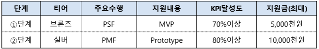 - 지원내용: 아이디어 구체화, MVP·Prototype 개발 지원 및 전문가 멘토링, IR 리허설 지원 등(시장검증형 사업화 지원금 최대 1,000만원)