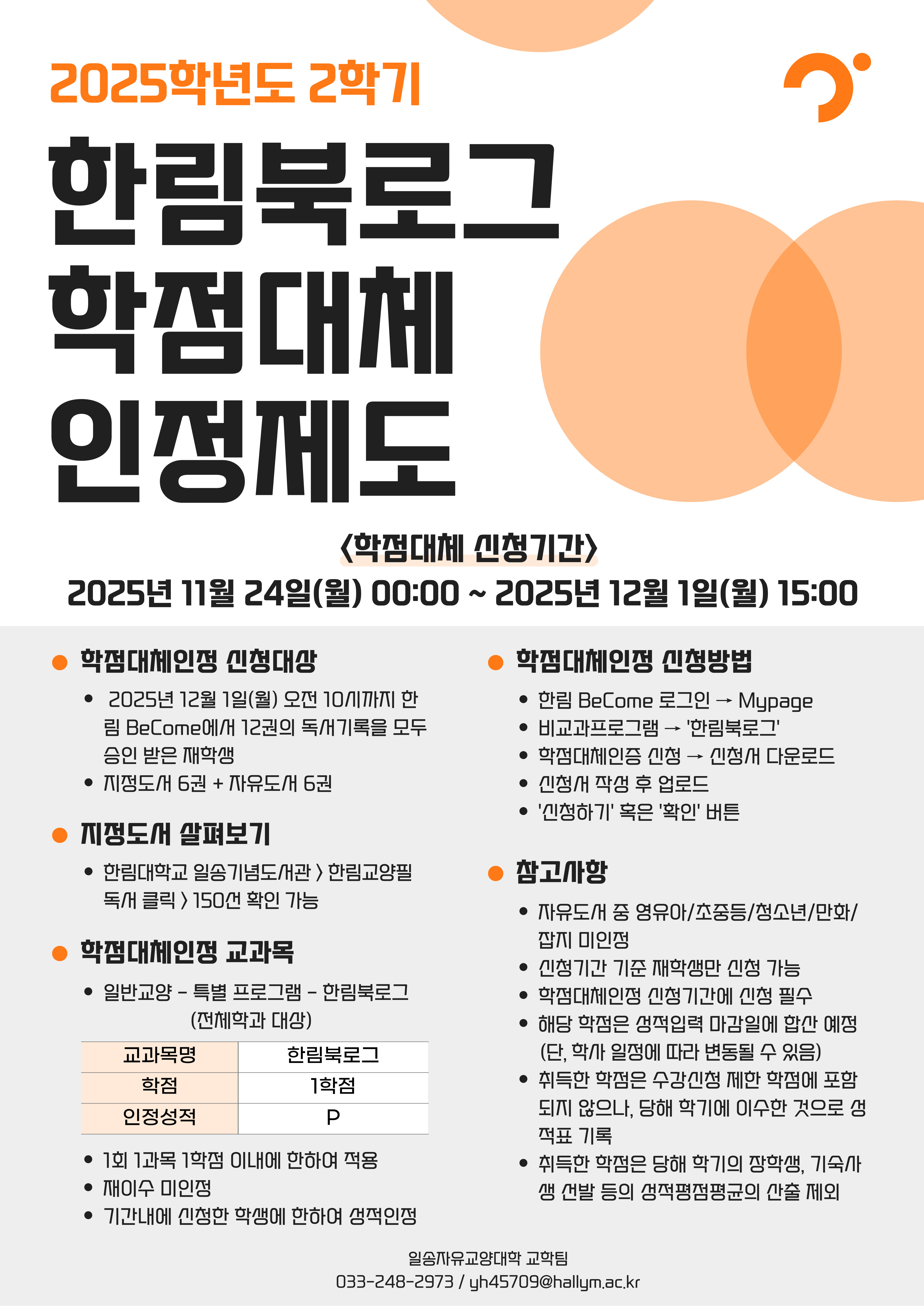 [1학점] 2025학년도 2학기 한림북로그 학점대체인정제도 시행 안내