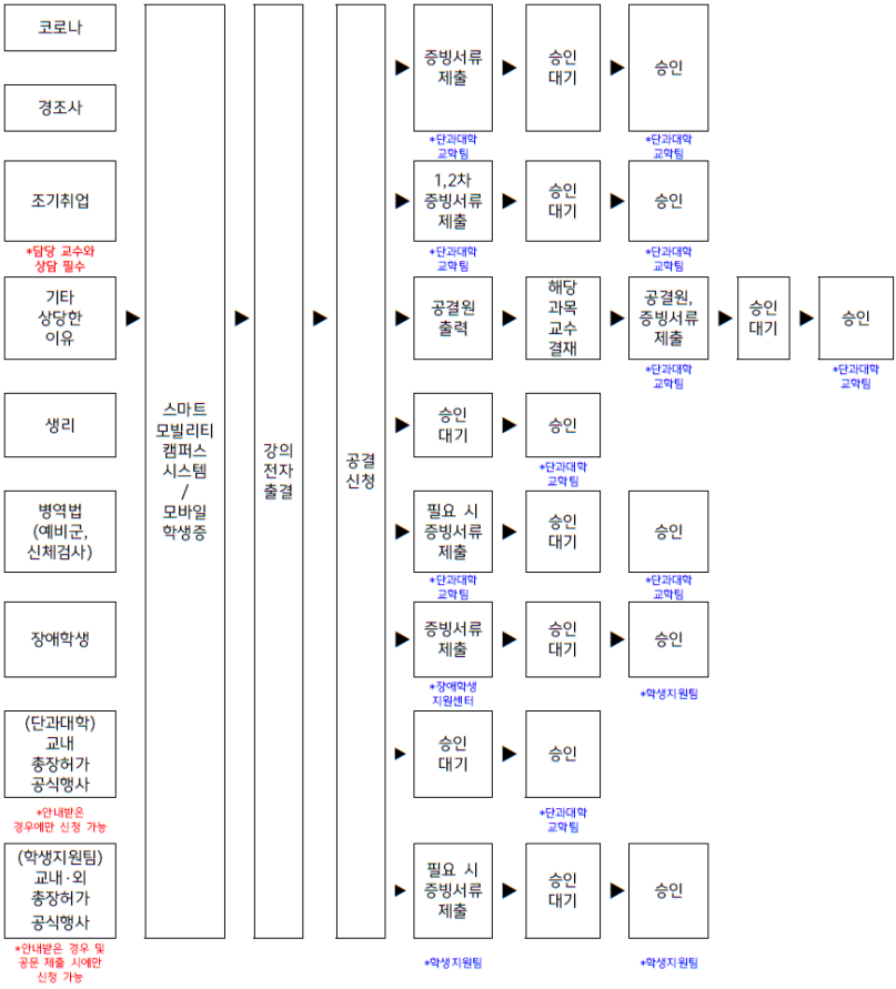 - 대면 수업 및 증세 악화에 따른 수업 수강 불가 시, 기준에 따라 공결 신청