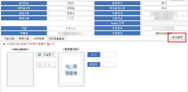 * 출력방법: 지원자화면 > 사진등록 - 우측 중앙 “원서출력” 버튼 있음
