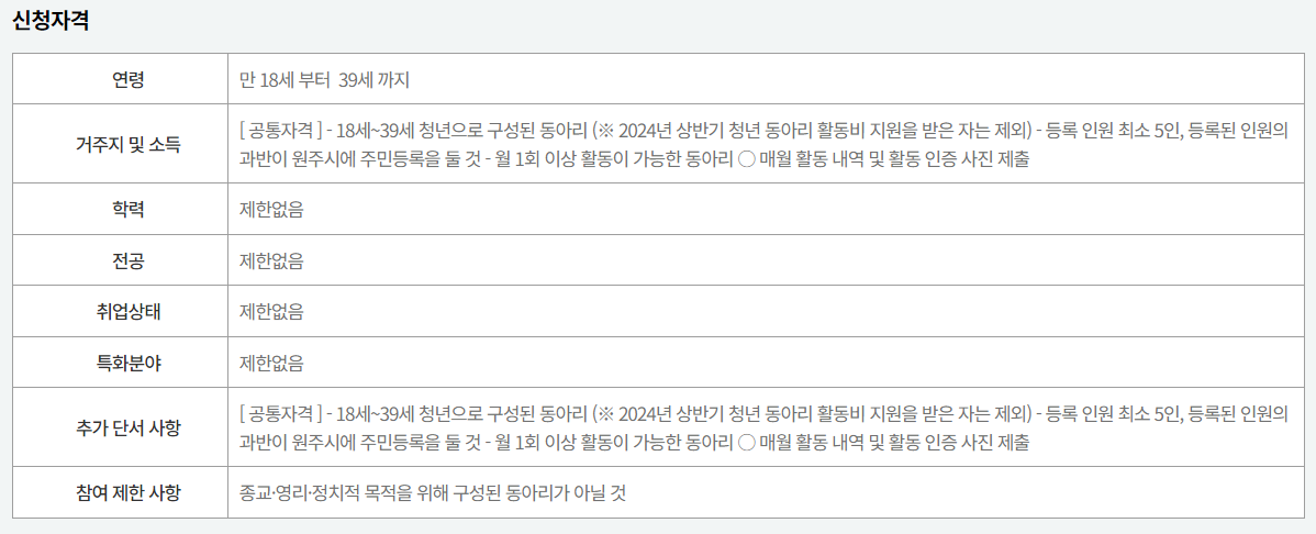원주시는 청년들의 성장을 지원하고, 청년들이 지역에 소속감을 갖고 정착할 수 있는 기반을 마련하고자, 청년 교류 활성화를 위한 청년 동아리 활동 지원사업을 시행하오니 관내 청년 동아리의 많은 관심과 지원 바랍니다.