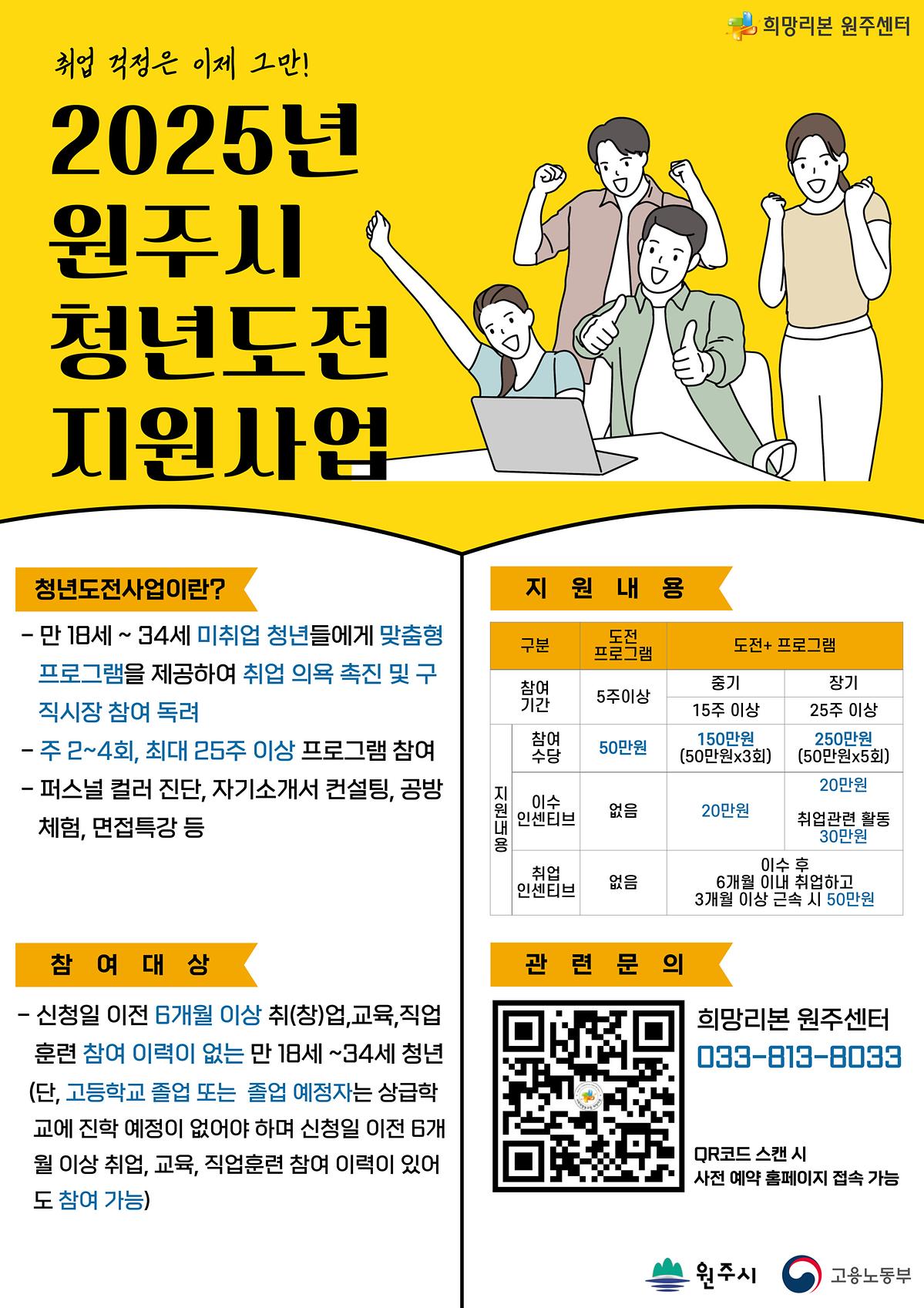 구직단념 청년 등을 대상으로 맞춤형 프로그램을 제공하여 청년의 구직의욕을 끌어올리고 취업 촉진을 지원하고자 "2025년 청년도전지원사업"(고용노동부 공모사업)을 실시합니다.