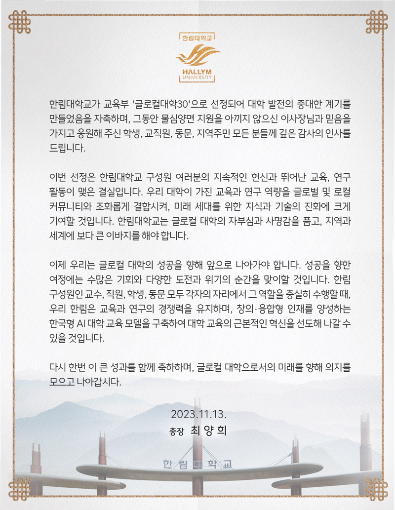 ‘2023 글로컬대학’에 우리 한림대학교가 최종 선정되었습니다.