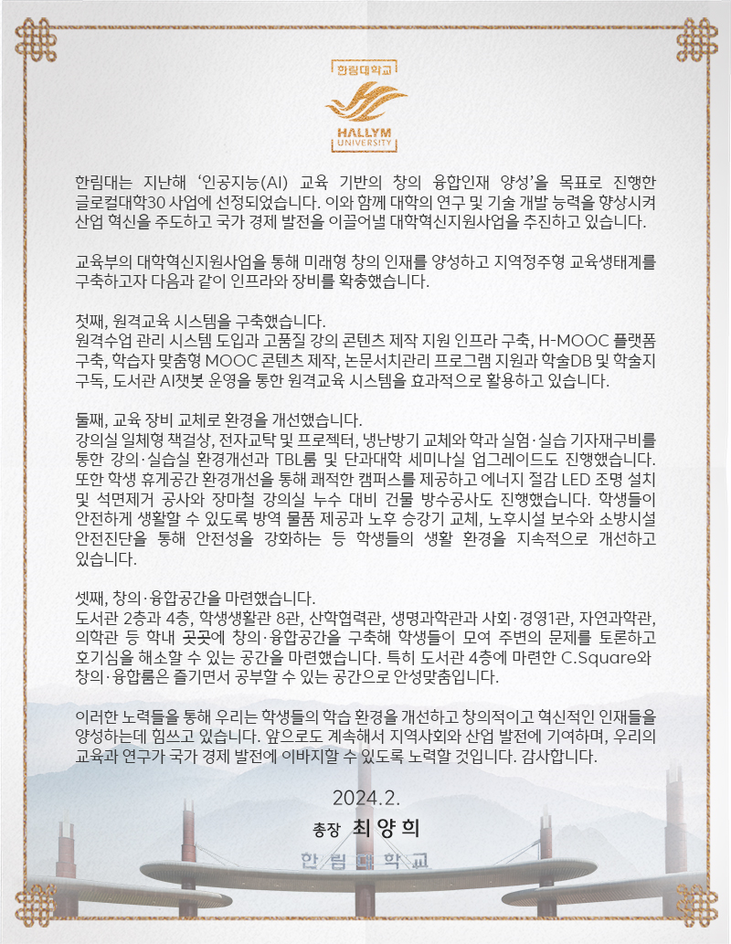 | 16 | ‘2023 글로컬대학’에 우리 한림대학교가 최종 선정되었습니다. |