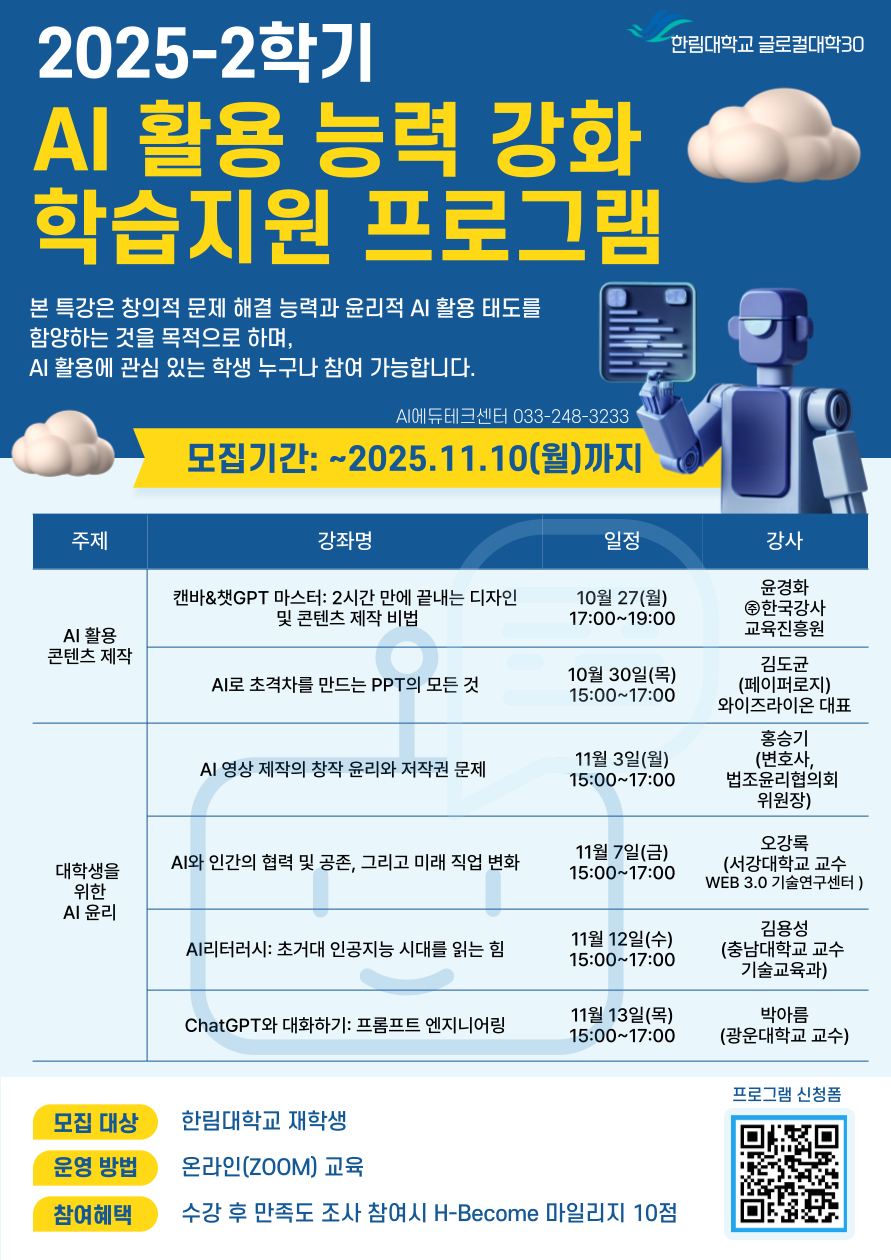 ★ [SmartLEAD] - [H-Square] - [2025-2학기 AI 활용 능력 강화 학습지원 프로그램 온라인 특강] 에서 신청 가능합니다 ★