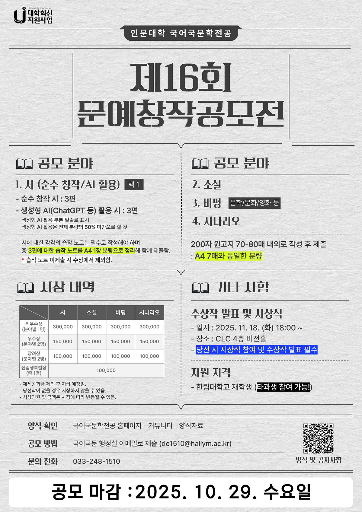 2025년 제16회 문예창작공모전 안내해 드립니다.