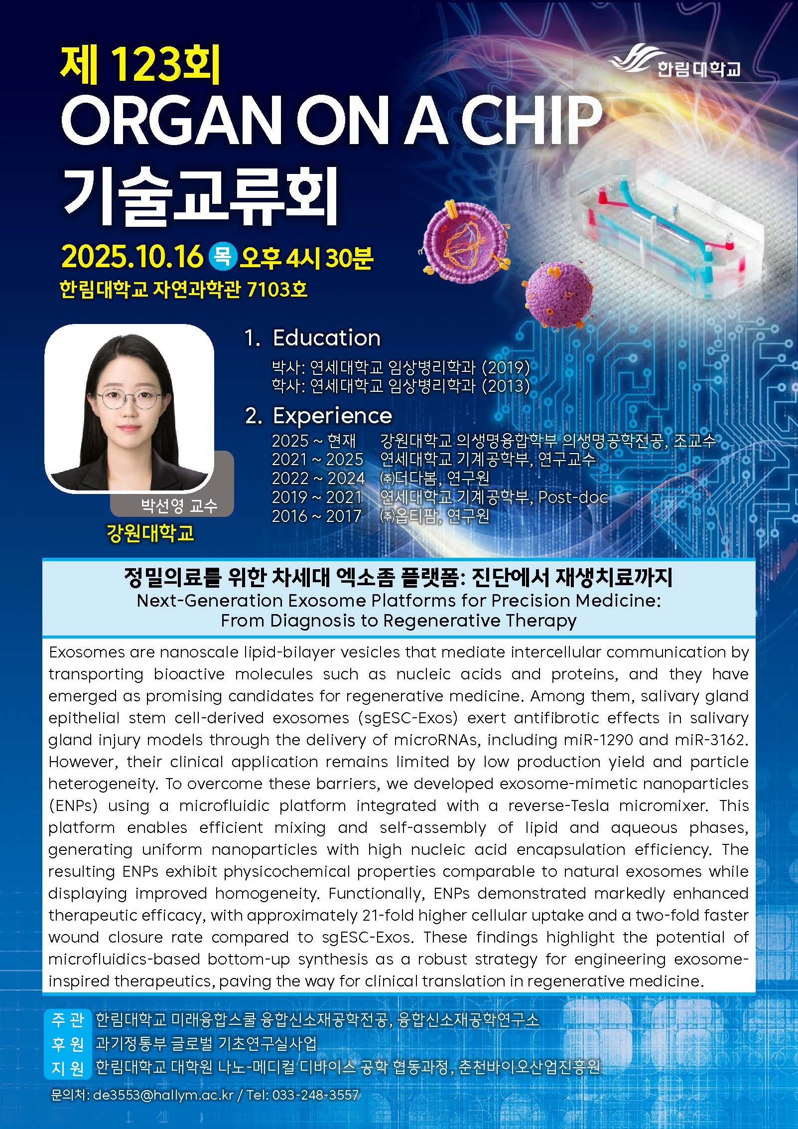 이번 기술교류회에서는 강원대 박선영 교수를 연사로 모시고 '정밀의료를 위한 차세대 엑소좀 플랫폼: 진단에서 재생치료까지' 를 주제로 강연이 진행되었다.
