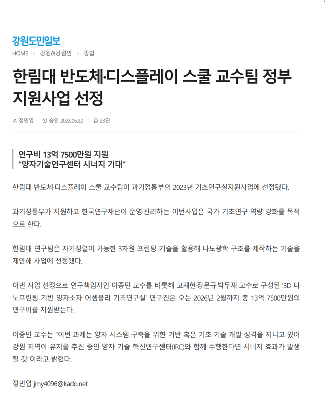 [강원도민일보]한림대 반도체·디스플레이 스쿨 교수팀 정부 지원사업 선정