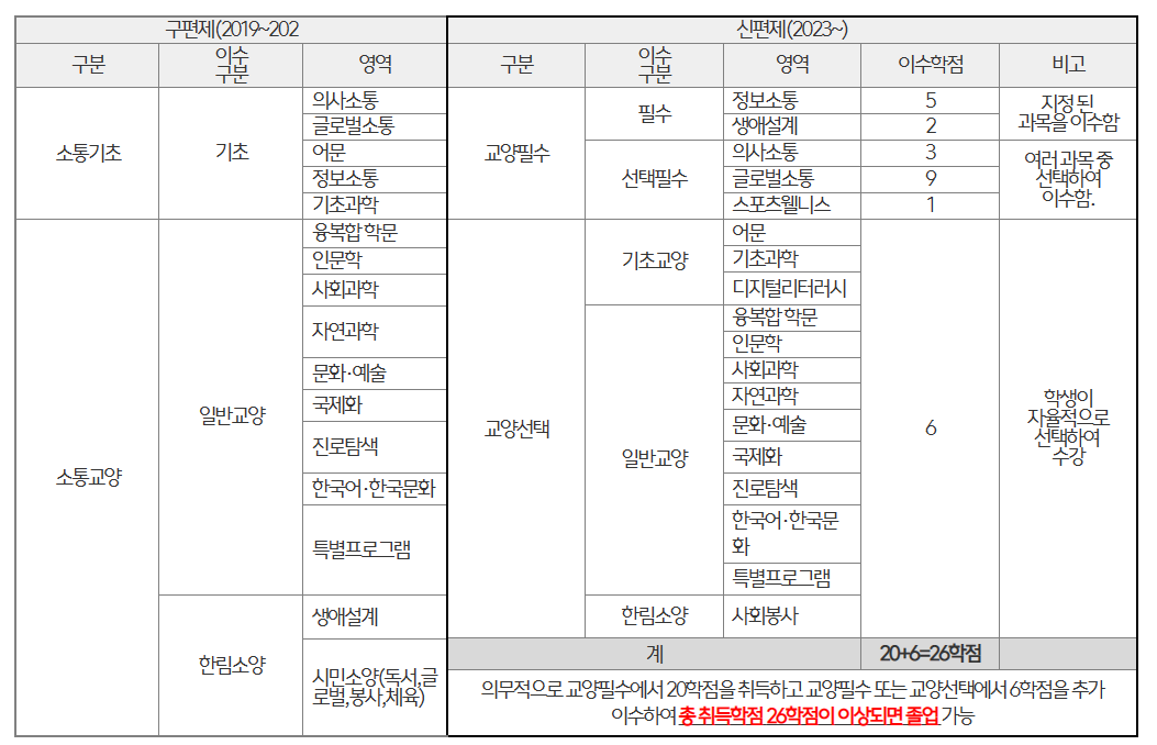 ※ 의과대학 및 글로벌융합대학은 교양필수·교양선택 이수기준은 따로 정함.(단과대학 교학팀 문의)