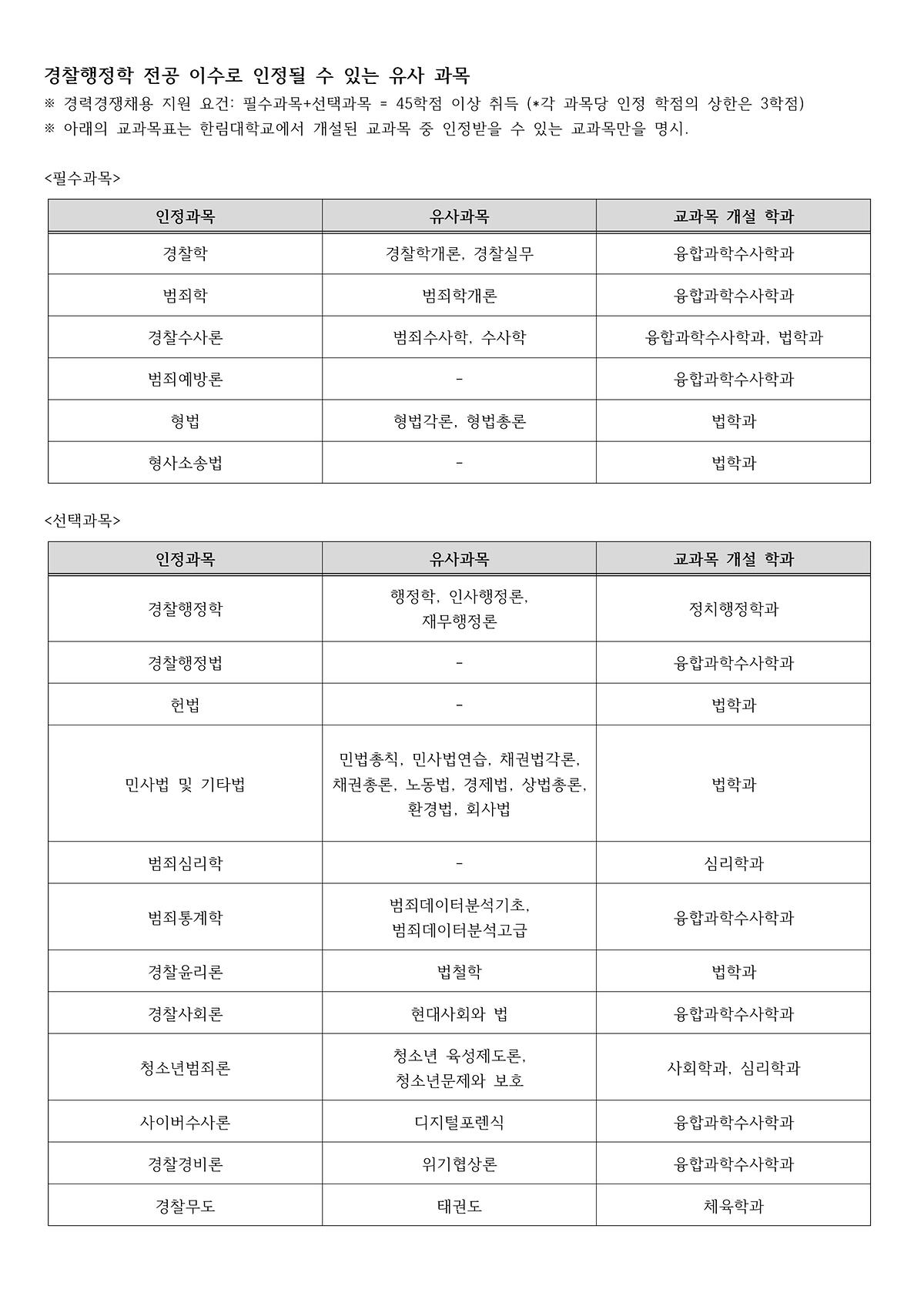 경찰행정학 전공 이수로 인정될 수 있는 유사 과목(경찰행정학 전공기수 인정과목에 관한 고시)을 안내드립니다.