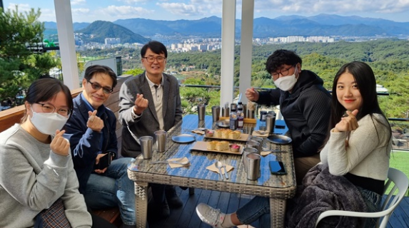 ▲ 정치행정학과 정용남 교수, 박병직 겸임교수, 춘청춘 팀(정치행정학과 윤정태 학생 포함)