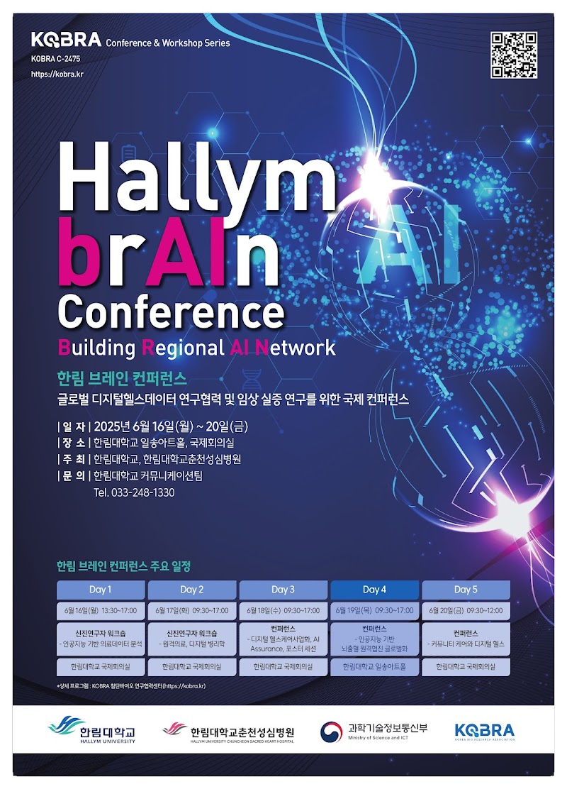 한림대학교와 한림대학교춘천성심병원 공동주관으로 글로벌 디지털헬스데이터 연구협력 및 임상 실증 연구를 위한 <Hallym brAIn Conference>를 다음과 같이 개최합니다.