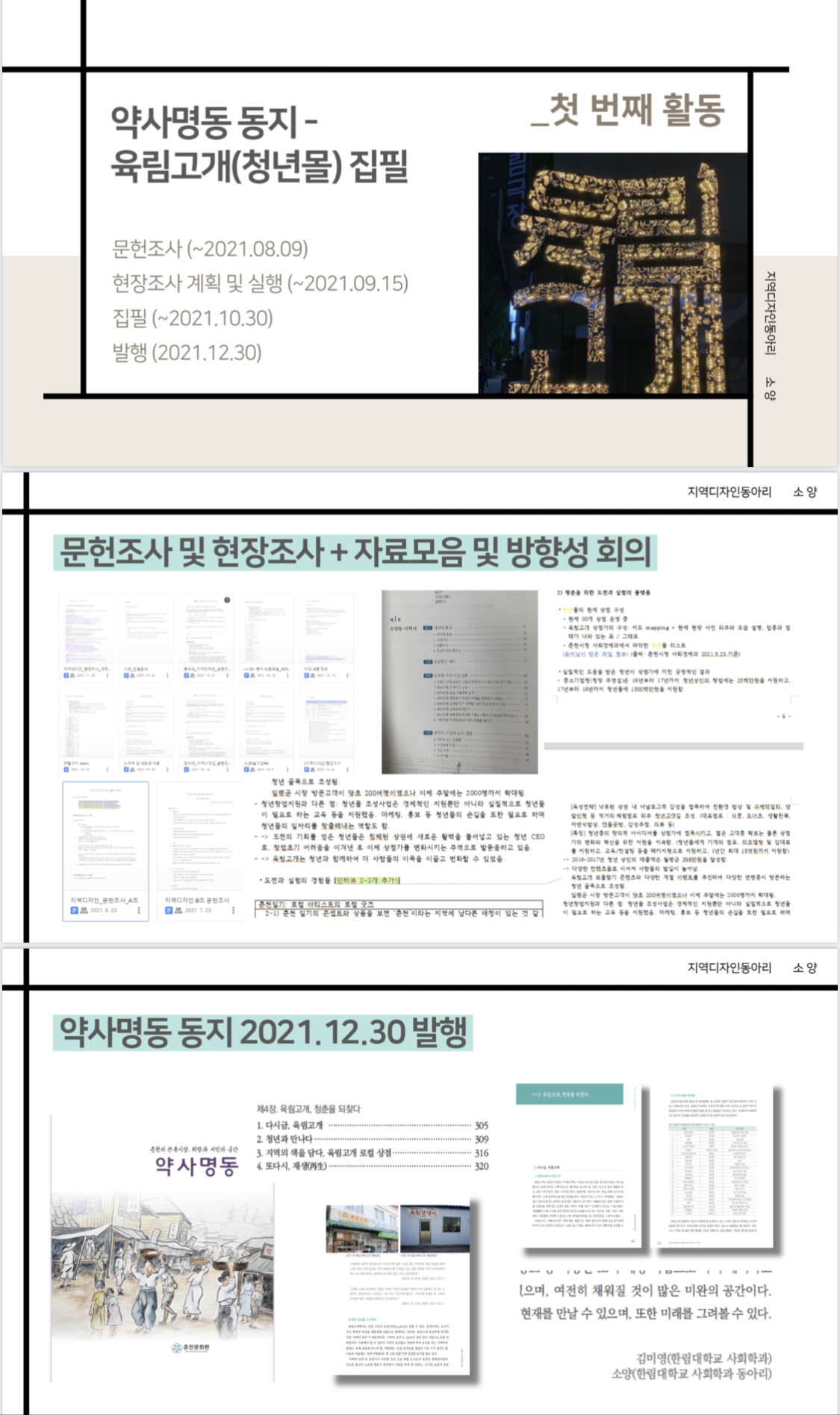 소양은 2021년 2학기부터 개설된 한림대학교 사회학과의 학술/지역디자인 동아리입니다. “소양”은 평소 닦아 높은 학문이라는 뜻의 소양과 한림대가 있는 춘천의 소양동에서 착안한 이름입니다. 지역사회 속에서 한국사회의 대안을 모색하고, 도시재생사업에 직접 참여하며 프로젝트 형식으로 사회적 가치를 추구합니다.