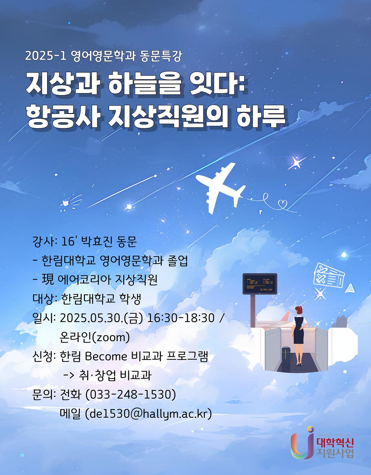▶ 신청: 한림 BeCome 홈페이지 [한림 BeCome 로그인] - [비교과프로그램] - [비교과프로그램 신청] - [취. 창업 비교과] – [2025-1 영어영문학과 동문특강]