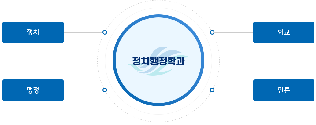 정치행정학과의 교육과정은 졸업생들이 크게 정치, 행정, 외교, 언론 등 크게 네 분야에서 활동할 수 있는 능력을 키우는데 집중됩니다. 정치가, 행정가, 외교관 등 공직에 진출할 수 있으며, 이를 뒷받침하기 위해 행정고시와 외무고시 및 중앙 및 지방의 일반 행정직, 외무직 등의 공무원시험에 도움을 줄 수 있는 커리큘럼과 함께, 일단 그러한 공직에 진출했을 때 이 사회의 정치인과 행정가 그리고 외교관으로서 갖추어야 할 기본지식과 교양을 함양하는데 필요한 교과과정을 제공하는 것이 정치행정학과의 목적입니다.